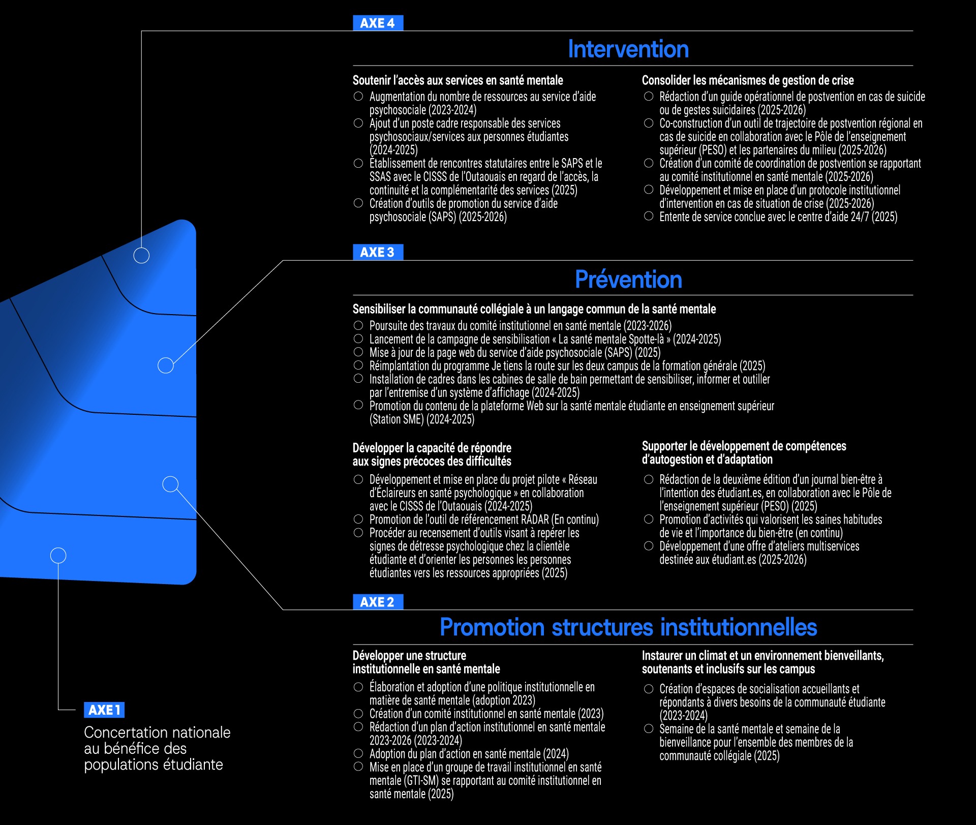 Le Plan d’action en santé mentale se décline en quatre axes d’intervention, comportant vingt mesures au total. Les mesures retenues visent à agir sur divers déterminants de la santé mentale par l’entremise d’une approche systémique proposant des actions qui s’inscrivent dans un continuum. Elles appellent à la mobilisation de l’ensemble des parties prenantes de l’établissement d’enseignement. Cet ensemble est responsable de l’amélioration et du maintien de la santé mentale des membres de sa communauté. La santé mentale des étudiant.es est donc une responsabilité partagée par l’ensemble des actrices et acteurs du milieu et se reflète à tous les niveaux institutionnels : environnement, structures organisationnelles, politiques et pratiques en place.