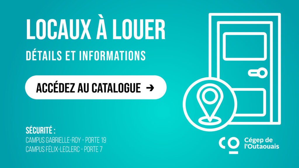 Le Cégep de l’Outaouais offre la possibilité de réserver différents espaces sur ses campus Gabrielle-Roy et Louis-Reboul (secteur Hull) ainsi que sur le campus Félix-Leclerc (secteur Gatineau). Ces locaux sont accessibles aux personnes étudiantes et à la population.