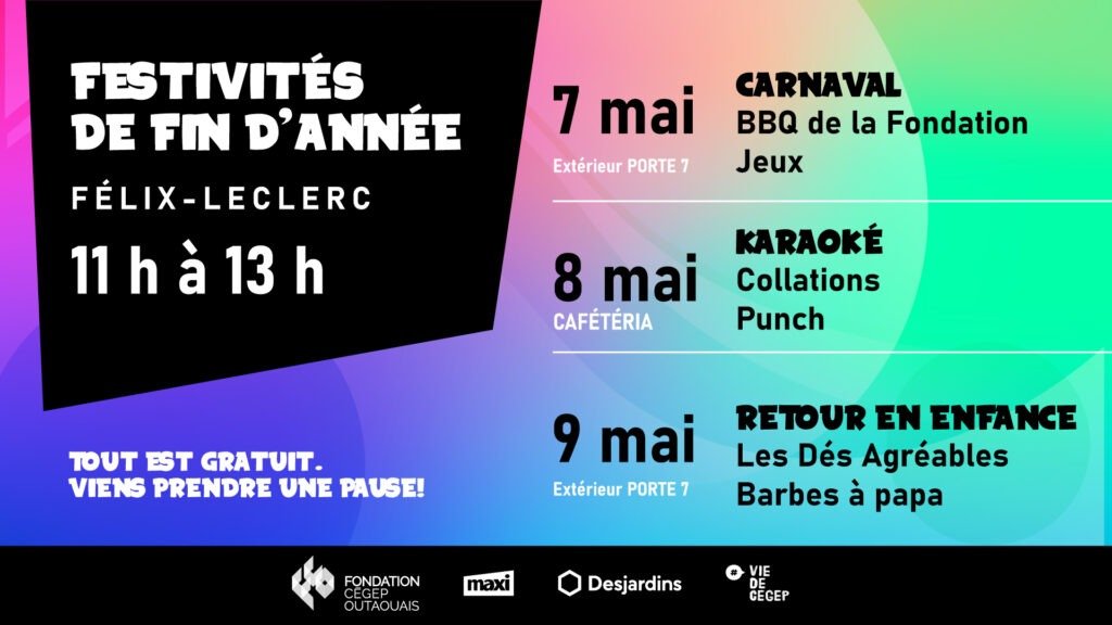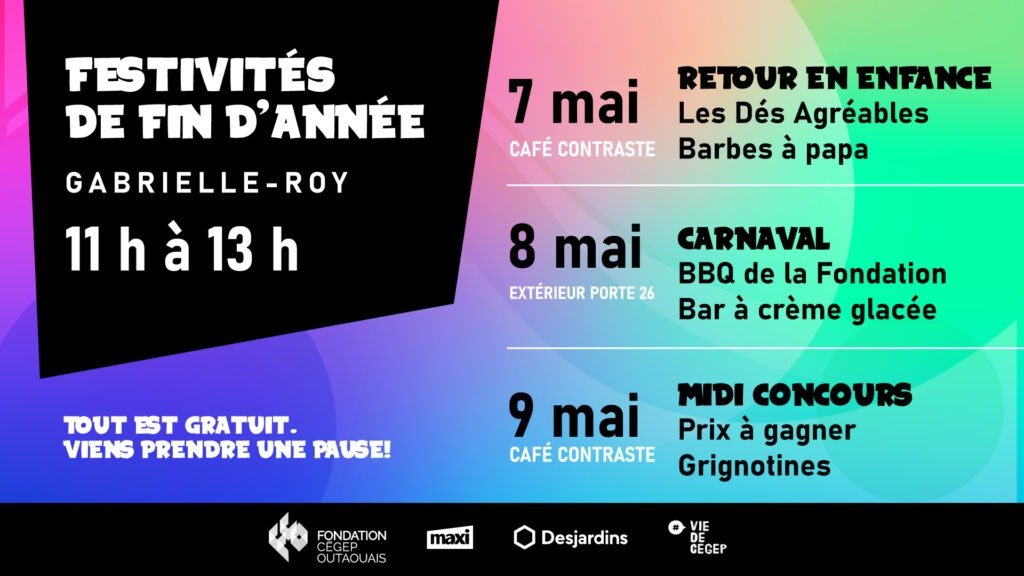 Venez prendre une pause les 7-8-9 mai prochain, plusieurs gratuités seront distribuées grâce à la contribution de la Fondation du Cégep de l’Outaouais!