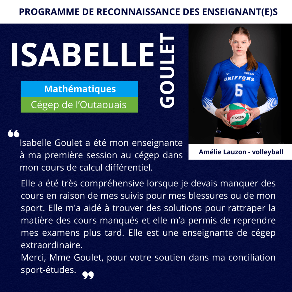 Ces 30 enseignant(e)s dévoué(e)s ont été sélectionné(e)s par l’Alliance Sport-Études parmi plus de 160 candidatures reçues. Toutes ces candidatures ont été transmises via des témoignages d’étudiantes et étudiants-athlètes qui ont proposé une enseignante ou un enseignant ayant joué un rôle significatif dans leur réussite scolaire et leur conciliation sport-études. Parmi ces enseignant(e)s nous retrouvons Isabelle Goulet, enseignante en mathématiques au Cégep de l’Outaouais, « taggée » par Amélie Lauzon, étudiante-athlète en volleyball. Une preuve qu’un(e) bon(ne) enseignant(e) peut faire toute la différence dans le parcours des étudiant(e)s.