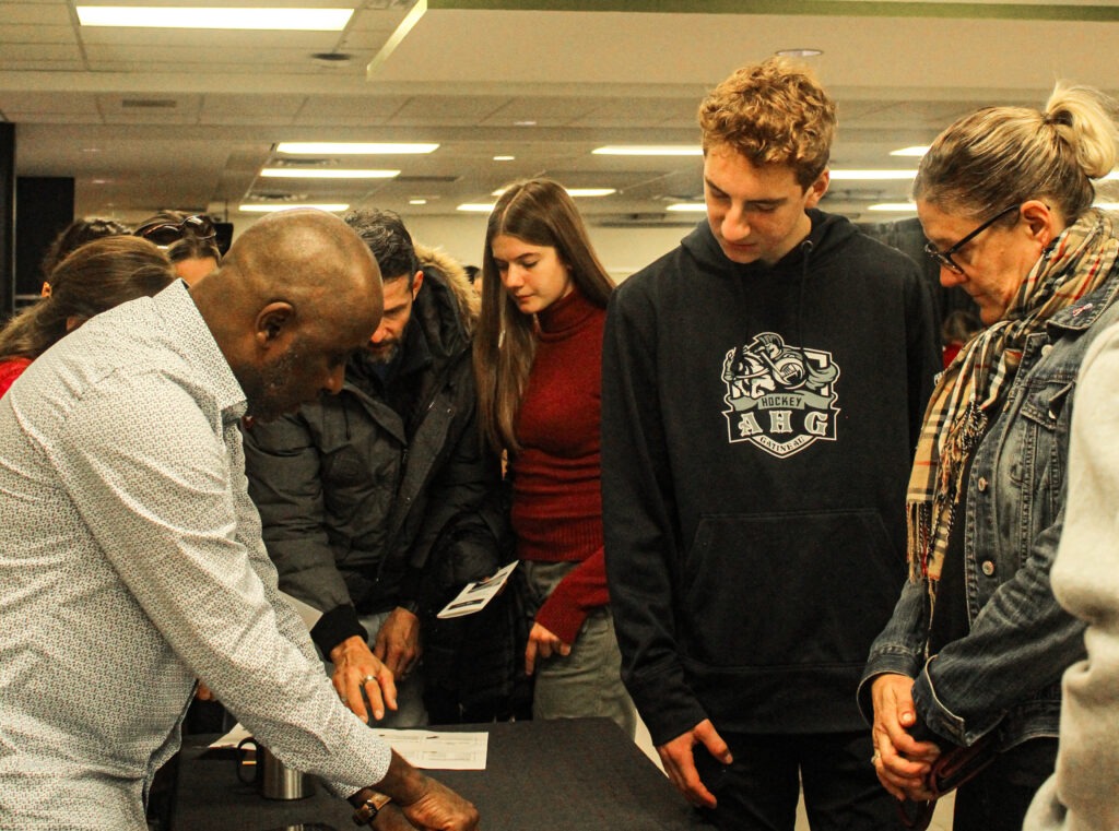 Pour l’occasion, nous avons accueilli d’anciens joueurs, entraîneurs et organisateurs qui sont venus souligner ce grand moment avec la famille des Crinqués. Entre autres, il y avait Étienne Rondeau et Simon Charron qui ont été organisateurs des Crinqués à titre de Conseiller à la vie étudiante. Il s’agit du même Simon que le Trophée Simon Charron intronisé il y a quelques années à titre de cofondateur de la ligue des Crinqués.