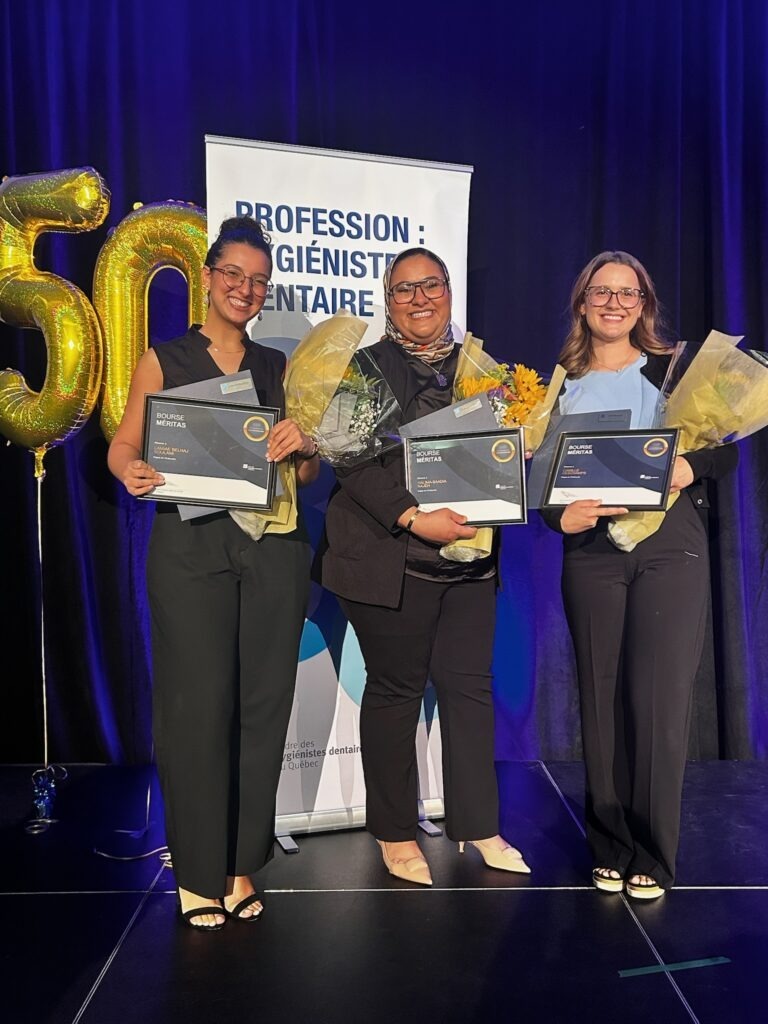 Trois de ces bourses ont été attribuées à des diplômées du programme de Techniques d’hygiène dentaire du Cégep de l’Outaouais : Lamiae Belhaj Soulami, Halima-Saadia Najeh et Camille Deschamps!
