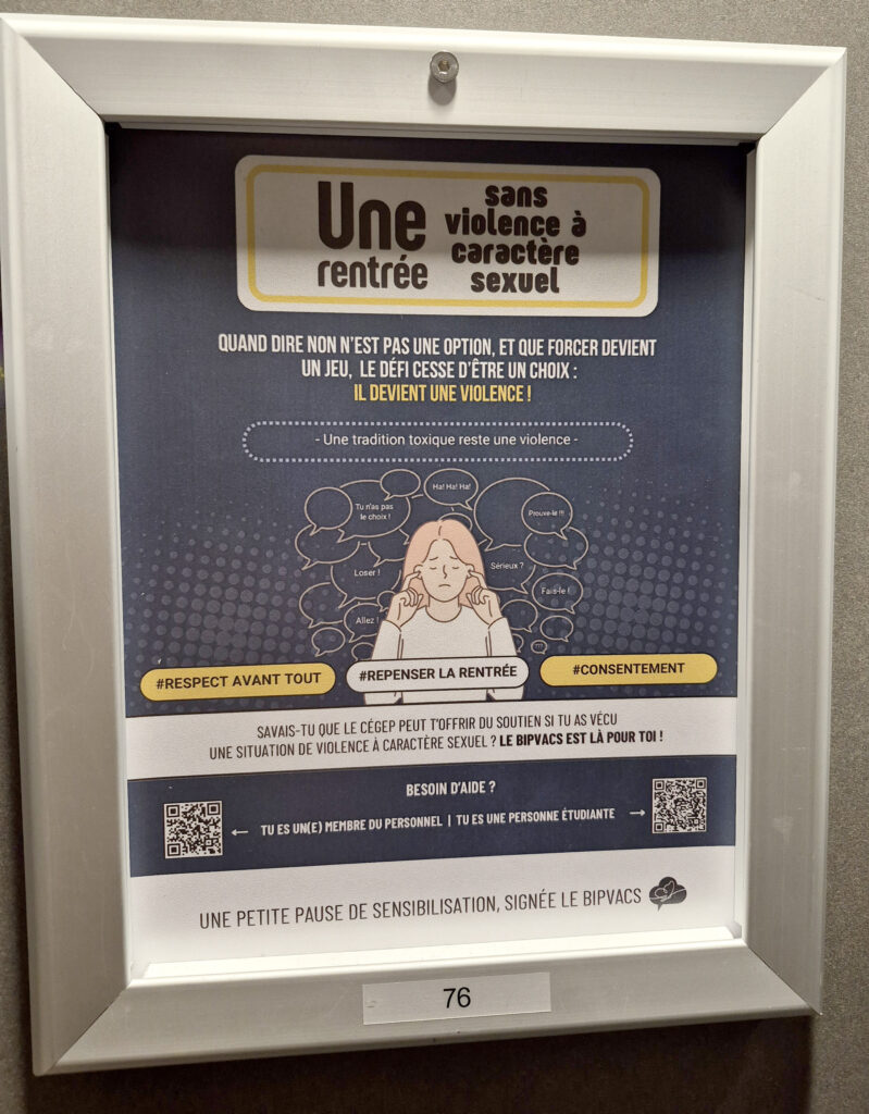 L’idée est simple : offrir à l’ensemble de la communauté collégiale un accès clair, direct et confidentiel à des ressources utiles. Ces cadres abordent principalement des enjeux de santé mentale et de violences à caractère sexuel, des réalités importantes malheureusement trop souvent vécues dans notre société.