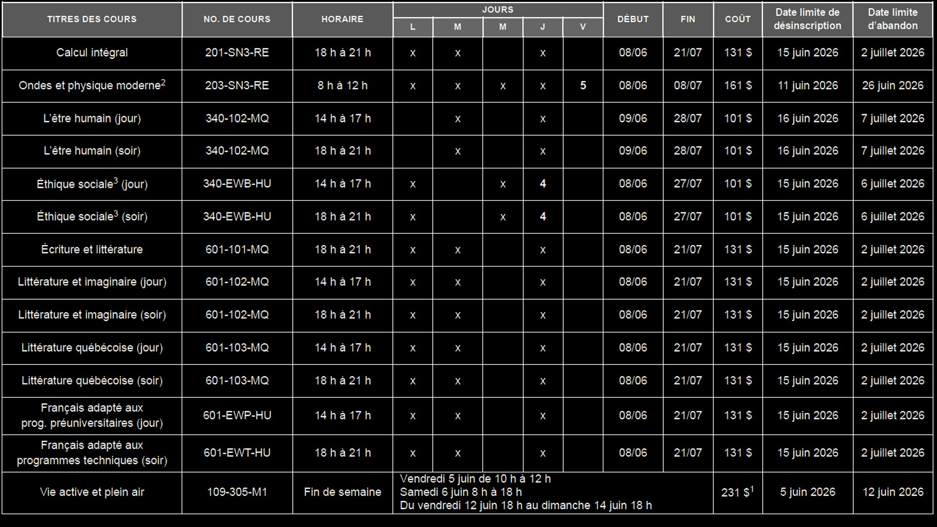 - Une inscription à un cours d’été est conditionnelle à la réussite de son cours préalable.
